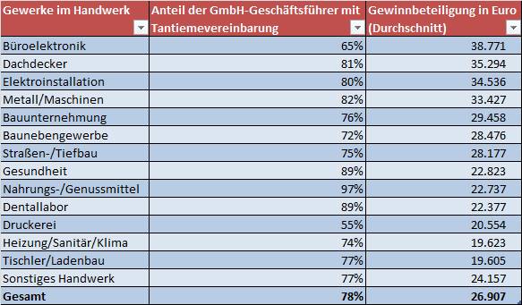 Bei durchschnittlich 78 Prozent der Handwerkschefs ist einen Tantiemen-Vereinbarung in das Jahresfestgehalt integriert. Dieser Anteil bekommt im Durchschnitt eine Gewinnbeteiligung von knapp 27.000 Euro. Bauunternehmer, Chefs von Baunebengewerben oder Unternehmen im Straßen-/Tiefbau liegen deutlich über dem Durchschnitt.