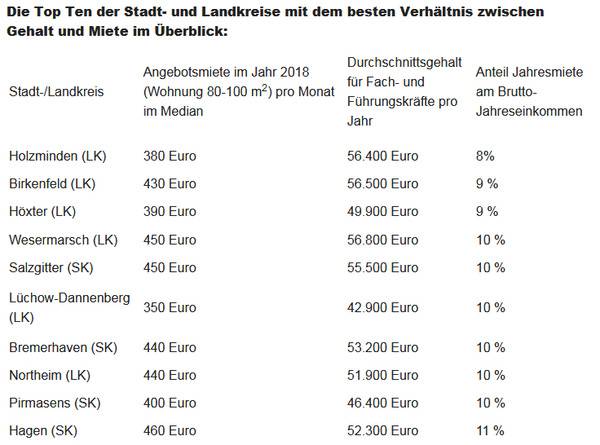 Das mit Abstand beste Verhältnis von Einkommen und Mietpreisen finden Jobsuchende im niedersächsischen Holzminden. Fach- und Führungskräfte verdienen dort im Schnitt 56.400 Euro brutto im Jahr. Eine 80 bis 100 Quadratmeter große Wohnung wird dort für 380 Euro angeboten - gerade einmal 8 Prozent des Gehalts gehen somit für die Miete drauf. In der Top Ten (siehe Bildergalerie) derjenigen Stadt- und Landkreise mit dem besten Verhältnis zwischen Gehalt und Miete ist Niedersachsen insgesamt mit gleich fünf Stadt- und Landkreisen (Holzminden, Wesermarsch, Salzgitter, Lüchow-Dannenberg und Northeim) vertreten. Auch im rheinland-pfälzischen Birkenfeld und nordrhein-westfälischen Höxter (beide 9 Prozent) bleibt nach Abzug der Miete besonders viel Geld in der Tasche.