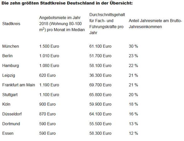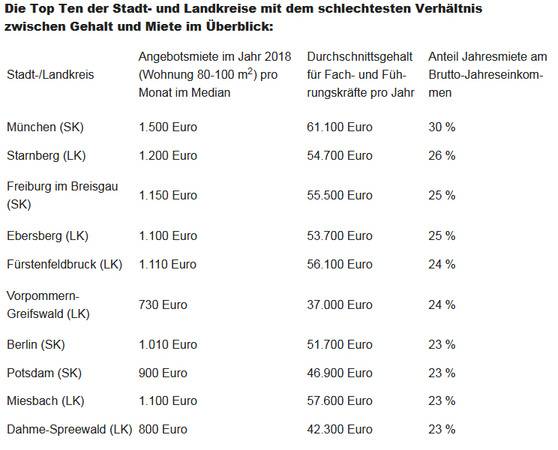 Der Stadtkreis München bildet dabei das negative Extrem: Fach- und Führungskräfte können dort zwar im Schnitt ein Jahresgehalt von 61.100 Euro erwarten. Eine Wohnung mit 80 bis 100 Quadratmeter kostet jedoch im Median auch 1.500 Euro im Monat. Vom hohen Brutto-Einkommen gehen damit 30 Prozent für die Miete drauf.