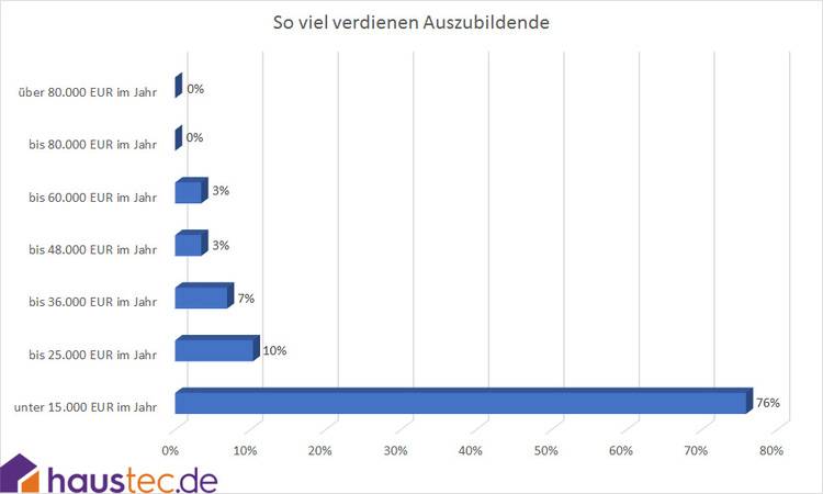 Die absolute Mehrheit der Azubis in der Gebäudetechnik verdient unter 15.000 Euro. Diese Angaben machten 76 Prozent der Befragten. Weitere 10 Prozent gaben an, bis zu 25.000 Euro brutto pro Jahr zu bekommen.