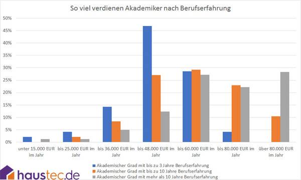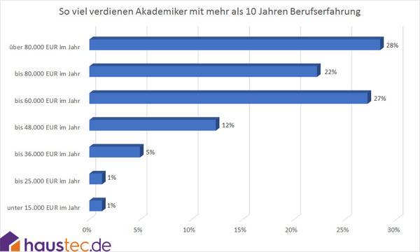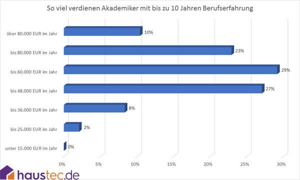 10 Prozent der Akademiker bekommen mit einer bis zu zehnjährigen Berufserfahrung über 80.000 Euro brutto Gehalt pro Jahr.