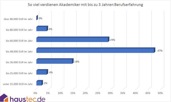 Beim Job-Einstieg verdienten sehr viele Akademiker (47 Prozent) ein Gehalt von maximal 48.000 Euro. 29 Prozent bekommen mit einer bis zu dreijährigen Berufserfahrung bis zu 60.000 Euro, nur 4 Prozent gaben an, mehr zu verdienen.