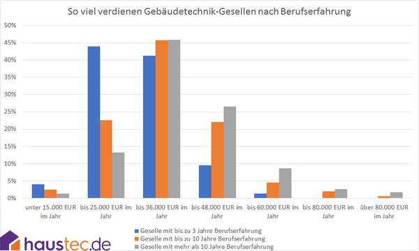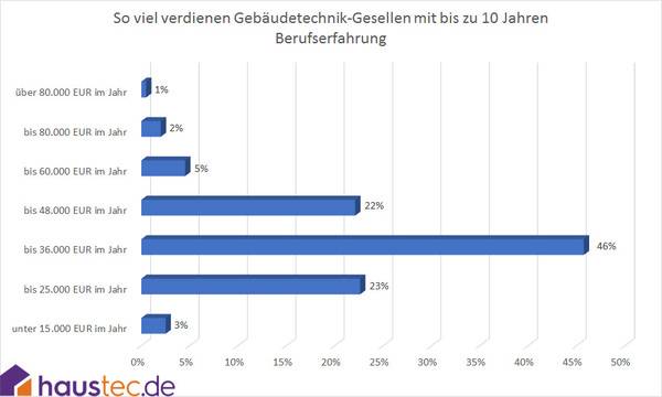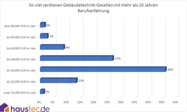 Auch der Großteil derer (46 Prozent), die über 10 Jahre im Beruf sind, kann nur mit maximal 36.000 Euro Bruttolohn pro Jahr rechnen. Allerdings nimmt der Anteil an einem höheren Einkommen in dieser Berufsgruppe zu: 27 Prozent der Gebäudetechnik-Gesellen erhalten bis zu 48.000 Euro im Jahr und 9 Prozent bis zu 60.000 Euro. Nur 3 Prozent verdienen bis zu 80.000 Euro und 2 Prozent mehr als 80.000 Euro.