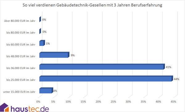 Laut einer aktuellen Studie des Bundesamtes für Statistik liegt das durchschnittliche Bruttojahresgehalt in Deutschland bei 41.292 Euro, Berufsanfänger in der Industrie verdienen rund 42.000 Euro Bruttojahresgehalt. Laut unserer Umfrage verdienen jedoch 70 Prozent der Gesellen in der Gebäudetechnik weniger als 36.000 Euro pro Jahr. Wer einen Meister-Abschluss hat, bekommt zwar durchschnittlich mehr, aber selbst mit viel Berufserfahrung immer noch weniger als Uni-Absolventen.