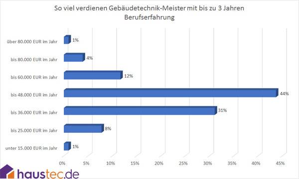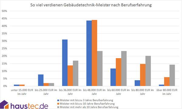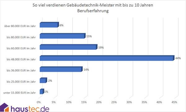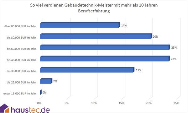 Bei einer Meister-Karriere in der Gebäudetechnik mit einer Berufserfahrung von mehr als 10 Jahren verdient ein Fünftel ein Jahresgehalt von bis zu 80.000 Euro. Fast genau so viele Meister (23 Prozent) verdienen bis zu 60.000 Euro bzw. bis zu 48.000 Euro (ebenfalls 23 Prozent).
