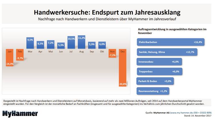Im Hinblick auf die anstehenden Feiertage rund um Weihnachten und Neujahr nimmt die saisonale Nachfrage im Dezember zwar um rund 25% gegenüber dem Vormonat ab. Dennoch gibt es einige Unternehmen, gerade im Bereich Elektrotechnik, bei denen auch in Richtung Jahresende überdurchschnittlich viele Aufträge eingehen. Pünktlich mit dem Start ins neue Jahr steigt auch die Handwerkersuche wieder auf ein deutlich höheres Niveau. Hier stehen dann vor allem Raumausstatter und Treppenbauer im besonderen Fokus der Verbraucher.