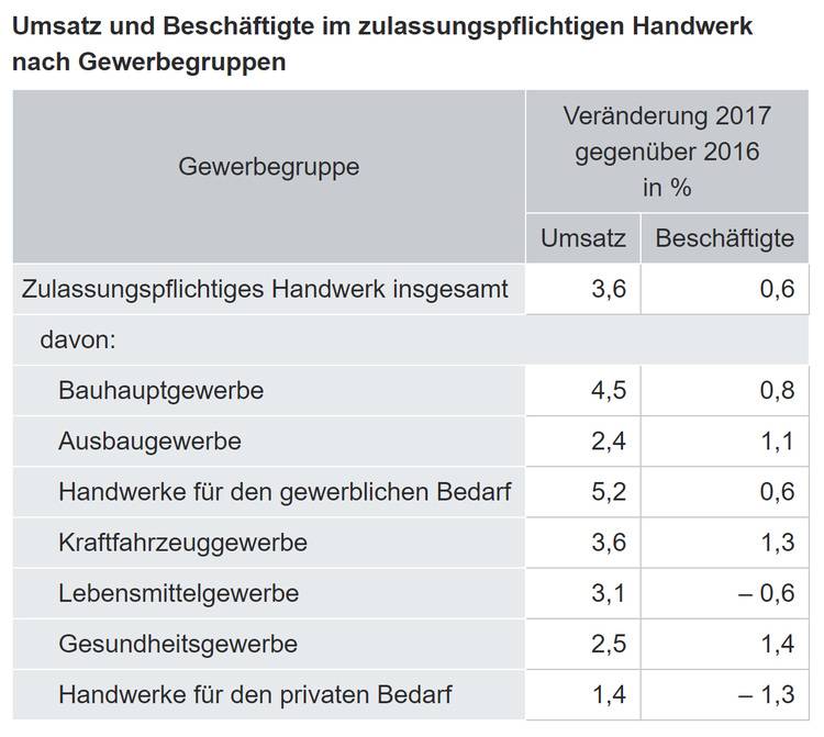 Im Jahr 2017 stiegen die im Rahmen der Umsatzsteuervoranmeldung gemeldeten Umsätze im zulassungspflichtigen Handwerk um 3,6% gegenüber dem Jahr 2016. Dies teilt das Statistische Bundesamt (Destatis) anhand vorläufiger Ergebnisse anlässlich der vom 7. bis 13. März 2018 stattfindenden Internationalen Handwerksmesse in München mit. Die Zahl der im zulassungspflichtigen Handwerk Beschäftigten stieg im Jahresdurchschnitt 2017 im Vergleich zum Vorjahr um 0,6%.