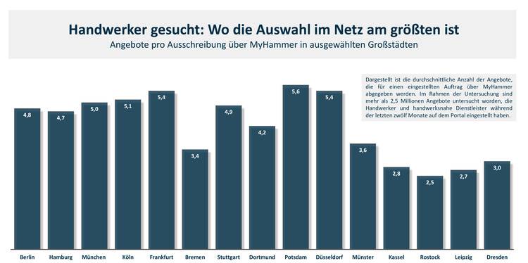 Die größte Auswahl an Handwerkern erhalten Verbraucher, wenn sie in Potsdam, Frankfurt am Main und Düsseldorf nach einem Fachmann im Netz suchen. Zwischen 5,4 und 5,6 Betriebe geben hier nach der Veröffentlichung eines Auftrags ein entsprechendes Angebot ab. Ähnlich aktiv sind die Betriebe in Mainz, Köln, Wiesbaden und München mit 5,0 bis 5,3 Angeboten je Ausschreibung. Auch in Stuttgart, Berlin und Hamburg stehen Auftraggebern mit 4,7 bis 4,9 interessierten Betrieben überdurchschnittlich viele Alternativen zur Verfügung.