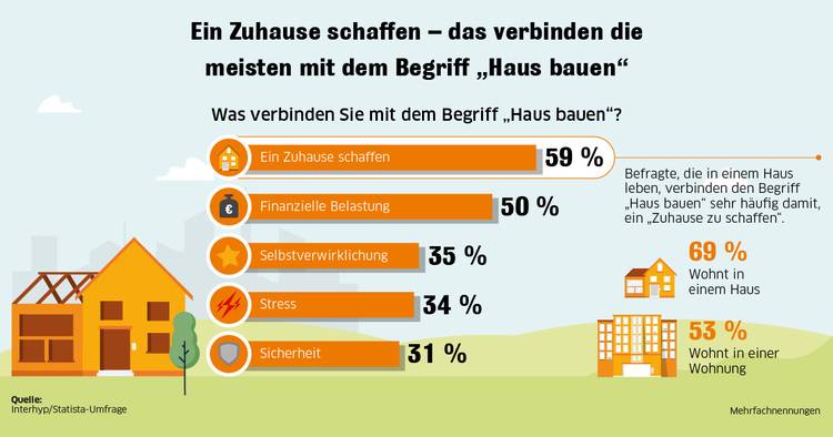 Für 59 Prozent bedeutet Hausbau, ein Zuhause zu schaffen, für 35 Prozent Selbstverwirklichung und für 31 Prozent Sicherheit. Der Begriff "Haus bauen" steht für jeden Zweiten (50 Prozent) allerdings ebenso für finanzielle Belastung und bei 34 Prozent der Befragten für Stress. Beim Haustyp würden die meisten Deutschen dem klassischen Massivhaus den Vorrang geben (34 Prozent), gefolgt vom Fertighaus (25 Prozent). Etwas weniger gefragte Haustypen sind demnach ein Architektenhaus (17 Prozent) oder ein Passivhaus (13 Prozent).