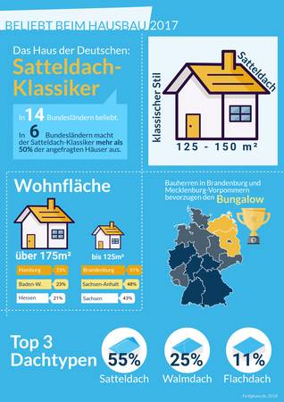 In Sachen Haustyp ist der Satteldach-Klassiker besonders beliebt gefolgt von Bungalows. Mehr dazu in den folgenden Infografiken des Portals Fertighaus.de.