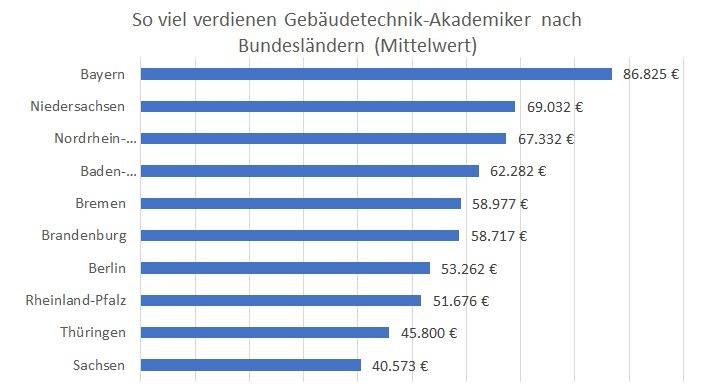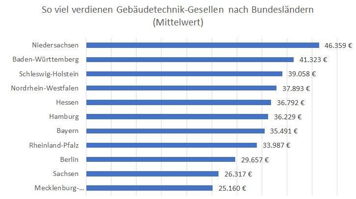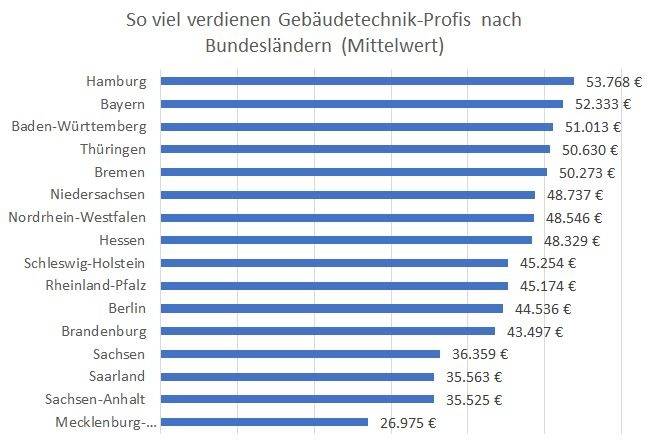 Am besten verdienen Profis der Gebäudetechnik in Hamburg. Hier beträgt das durchschnittliche Bruttojahresgehalt 53.768 Euro. Dahinter folgen Bayern (52.333 Euro) und Baden-Württemberg (51.013 Euro). Mögliche Erklärungen für diese Verteilung sind zum einen die hohen Lebenshaltungskosten in Hamburg, Stuttgart oder München. Weiterhin sorgt das geringere Angebot an Handwerksbetrieben in den Stadtstaaten wie beispielsweise Hamburg oder Bremen für weniger Konkurrenzdruck. Das kann sich positiv auf die Löhne auswirken. Demgegenüber liegen die Lebenshaltungskosten in NRW deutlich unter denen in Bayern oder Baden-Württemberg. Gleichzeitig liegt NRW beim Betriebsbestand auf Platz 2. Dort gibt es also wesentlich mehr Konkurrenzbetriebe.