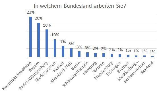 Insgesamt spiegelt sich die Höhe der Einwohnerzahl der Bundesländer auch in der Verteilung der Umfrageteilnehmer wider. Die sechs einwohnerstärksten Länder sind: NRW, Bayern, Baden-Württemberg, Niedersachsen, Hessen und Rheinland Pfalz. Das sind auch die Top 6 Länder, in denen die Befragten beschäftigt sind. Hier sehen Sie die gesamte Verteilung nach Bundesland: