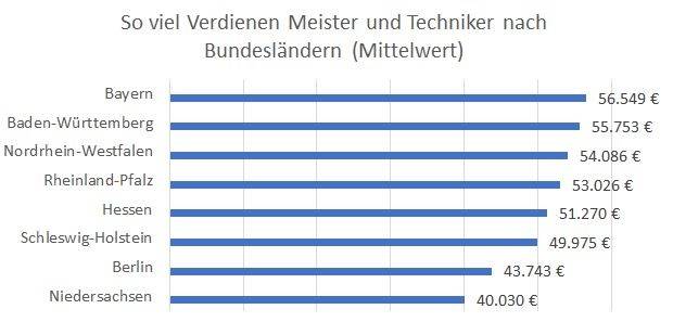 Die besten Gehälter für Meister und Techniker gibt es in Süddeutschland. Auf Platz 1 liegt Bayern mit einem durchschnittlichen Bruttojahreseinkommen von 56.549 Euro. In Baden-Württemberg verdient diese Berufsgruppe im Schnitt 55.753 Euro. Die Top 8 Bundesländern sind: