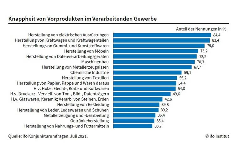 Die Knappheit bei Halbleitern und Chips macht sich insbesondere bei den Herstellern elektrischer Ausrüstungen bemerkbar (84,4 Prozent) sowie bei den Autoherstellern und ihren Zulieferern (83,4 Prozent). Die stark gestiegenen Preise für Kunststoff-Granulate machen den Herstellern von Gummi- und Kunststoffwaren deutlich zu schaffen (79 Prozent). Bei den Herstellern elektronischer Geräte beklagen 72,2 Prozent Materialmangel, außerdem 70,3 Prozent der Maschinenbauer.