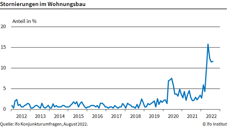 „Seit April sehen wir, dass auffällig viele Projekte gestrichen werden. Die Rahmenbedingungen für den Wohnungsbau haben sich in den letzten Monaten massiv verschlechtert: Explodierende Baukosten, steigende Finanzierungszinsen und eingeschränkte Fördermöglichkeiten belasten die Kalkulation potenzieller Bauherren schwer. Einige Projekte werden damit unrentabel“, erklärt ifo-Forscher Felix Leiss.