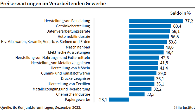 Die kräftigsten Preisanhebungen werden im Lebensmittel-Einzelhandel geplant. Dort liegen die Preiserwartungen bei 83,7 nach 94,7* Punkten im November. Auch bei den Drogerien und im Spielwaren-Handel gaben die Preiserwartungen nach, auf 72,0 von 91,4* bzw. auf 77,0 von 94,5* Punkten. In der Gastronomie planen hingegen mehr Unternehmen Preisanhebungen (63,4 nach 57,1*). Das gilt auch für den Einzelhandel mit Bekleidung (52,9 nach 32,4*) sowie mit Heimtextilien und Teppichen (70,6 nach 48,2). Einzig die Papierindustrie plant derzeit Preissenkungen (minus 28,1 nach minus 10,8*).