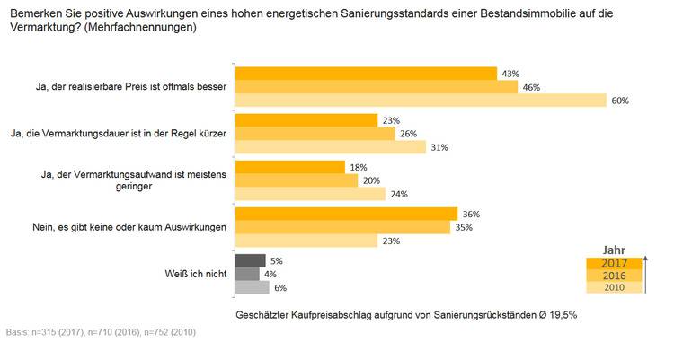 Auch bei Mietimmobilien ist die Frage nach energetischen Sanierungen so unwichtig wie noch nie. Hier sind 44 Prozent der Befragten der Ansicht, der energetische Zustand habe kaum oder keine Auswirkungen auf die Vermarktung. In Großstädten sind es sogar mehr als die Hälfte. Nur ein Viertel der Befragten berichtet, dass sich für eine energetisch sanierte Mietimmobilie ein höherer Mietpreis erzielen ließe - 2010 waren es noch 49 Prozent.