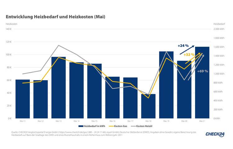 Der Mai 2021 war so kalt wie in den vergangen elf Jahren nicht. Daher mussten Verbraucher*innen 24 Prozent mehr Energie für das Heizen aufwenden als im Vorjahresmonat. Ein Haushalt mit Gasheizung zahlte im Mai 2021 25 Euro mehr als im Vorjahr. Ein Musterhaushalt mit Ölheizung musste sogar 41 Euro mehr für das Heizen zahlen als noch im Mai 2020.
