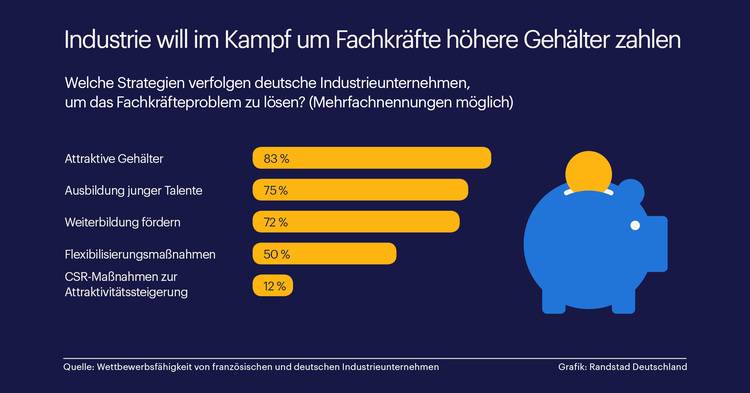 Als ergänzende langfristige Maßnahmen zu Gehaltssteigerungen setzen die Industrieunternehmen in Deutschland zudem immer stärker auf die eigene berufliche Ausbildung (75 %) und Weiterbildung des bestehenden Personals (72 %). Diese Initiativen sollen nicht nur bestehendes Fachwissen ausbauen, sondern auch neues Fachwissen bei Mitarbeitern schaffen, die das Unternehmen bereits bestens kennen.