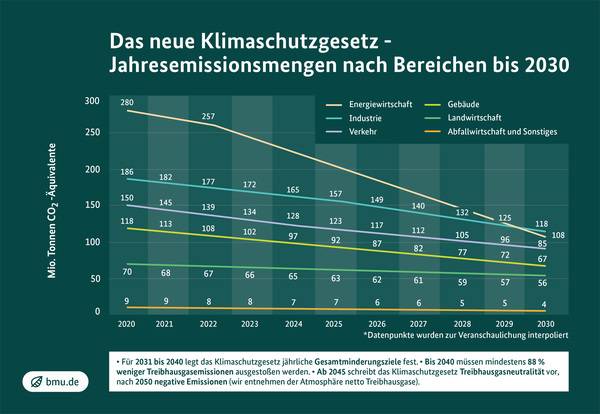 - Folge ist insgesamt, dass für die einzelnen Sektorfelder (z. B. Industrie, Verkehr und Gebäude) die jährlichen CO2-Absenkungen verschärft werden. Im Gebäudesektor soll der CO2-Ausstoß bis 2030 bis auf ein Drittel des Werts von 1990 gesenkt werden.