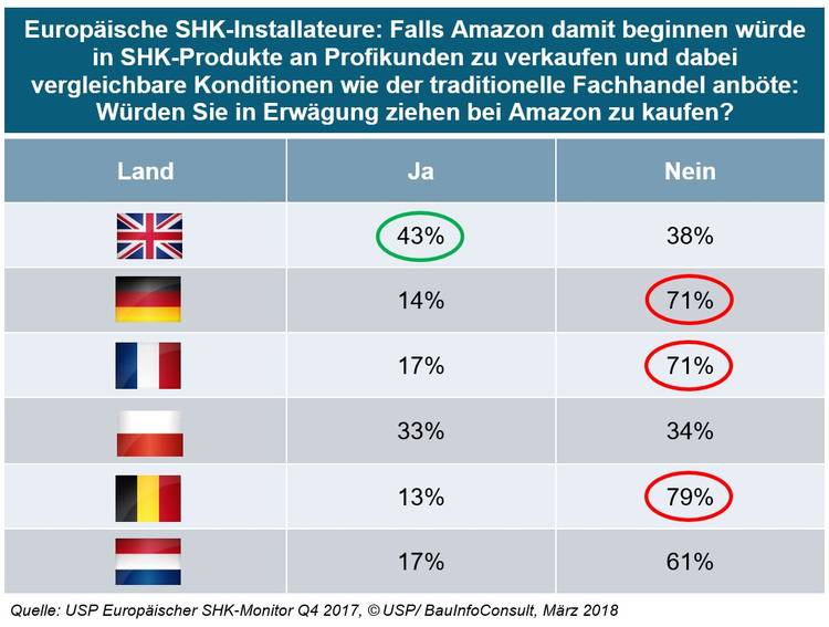 So wurden die SHK-Installateure zu einem bewusst zugespitzten Gedankenspiel aufgefordert: Würden sie bei Amazon Material für ihre Arbeit kaufen, wenn diese dort zu ähnlichen Konditionen wie im althergebrachten Fachhandel erhältlich wären? Mehr als 70 Prozent der befragten SHK-Handwerker in den allermeisten Ländern erschien dies abwegig – vor allem in Deutschland, Frankreich und den Beneluxstaaten.