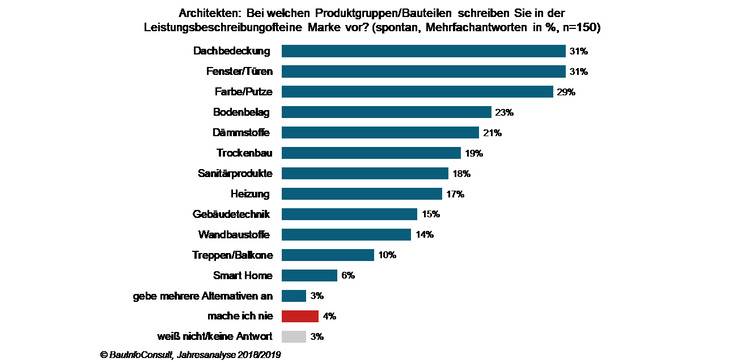 Die Leistungsbeschreibung der Architekten legt die Vorgehensweise in einem Bauprojekt bekanntlich stark fest, vor allem auch die erforderlichen Materialeigenschaften. Dabei kann der Architekt für unterschiedliche Produkte auch ganz konkrete Marken vorschreiben, die letztendlich verbaut werden sollen. Doch bei welchen Bauprodukten und Gebäudeteilen spielen Marken für die Leistungsbeschreibung überhaupt eine Rolle? BauInfoConsult hat sich in seiner aktuellen Branchenstudie ausführlich mit der Praxis in Bezug auf die Leistungsbeschreibung auseinandergesetzt und dabei in telefonischen Interviews von 150 Architekten genaue Einschätzungen zu den verschiedenen Produktkategorien erhalten.