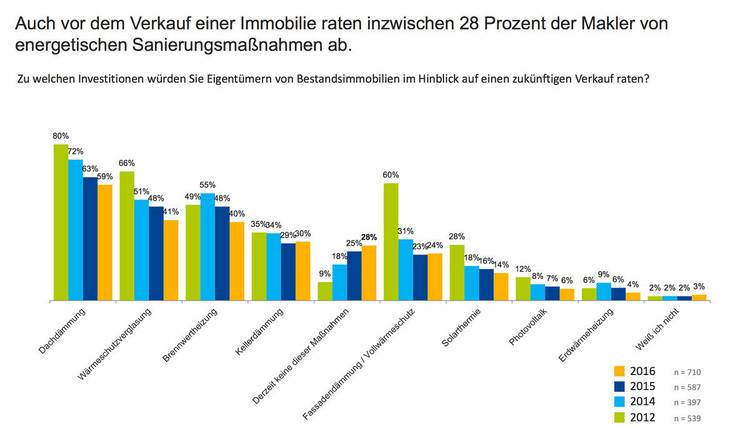 Zu diesem Ergebnis kommt der Marktmonitor Immobilien 2016 (MMI) vom Immobilienportal immowelt.de. Durch den anhaltenden Immobilien-Boom und die hohen Kosten für energetische Sanierungen seien die Investitionsempfehlungen weiter rückläufig. Zum Vergleich: 2015 hatten deutlich weniger Makler (17 Prozent) generell von energetischen Maßnahmen abgeraten - 2012 waren es sogar nur 8 Prozent.