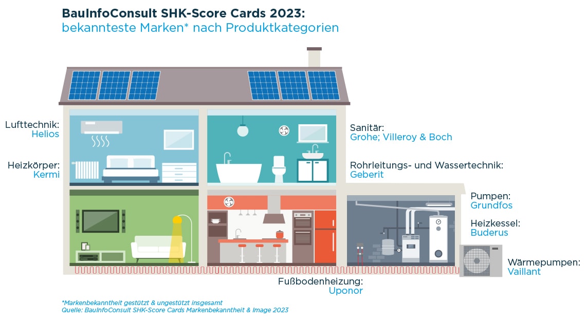 BauInfoConsult hat die Markenbekanntheit, das Markenimage und nicht zuletzt die Verwendung und Präferenz in verschiedenen Produktsegmenten in der Studie „Score Cards Markenbekanntheit“ untersucht. Dabei haben die Düsseldorfer Baumarketingprofis u. a. die Top-Herstellermarken in acht Kategorien ermittelt. Wie zu erwarten, finden sich vor allem illustre Namen auf dem Siegertreppchen. Zugleich warten die Ergebnisse der großen SHK-Markenstudie auch mit einigen Überraschungen auf – und geben überdies dem Marketing aufschlussreiche Hinweise zur Konversion von Markenbekanntheit zur Markennutzung und (last, but not least) zur Markenpräferenz im SHK-Handwerk.