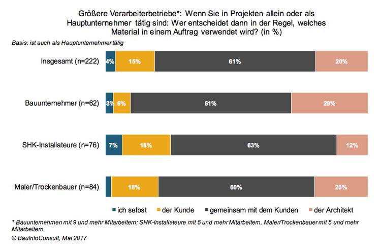 Betrachtet man die einzelnen Gewerke, so fällt auf, dass Bauunternehmer bei der Frage der Materialwahl auch relativ häufig dem Architekten den Vortritt lassen: Fast ein Drittel der Bauunternehmen gibt an, dass der Architekt darüber entscheidet, welche Werkstoffe nun wirklich verbaut werden sollen. Dies ist zum Teil im Arbeitsalltag begründet, da Bauunternehmen häufig im Neu-/Rohbau beschäftigt sind und dort der Architekt oft über die Ausschreibungen die Materialwahl schon vorab entscheidet.