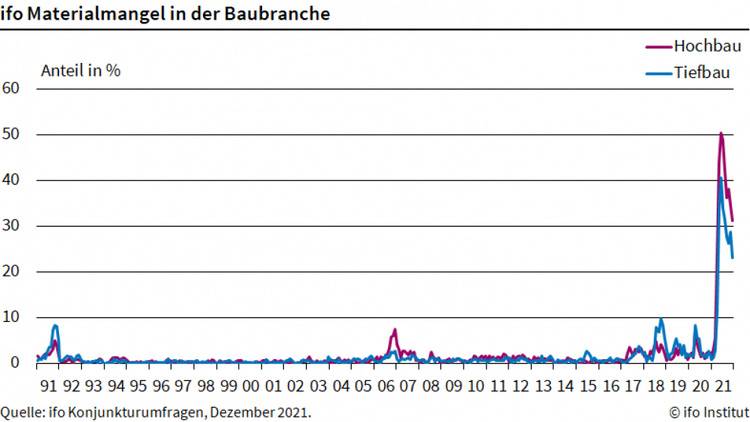 Auf dem Hochbau haben im Dezember noch 31,3 Prozent der Unternehmen Lieferprobleme erlebt, im Vormonat waren es 34,5 Prozent. Das geht aus einer Umfrage des ifo Instituts hervor. Im Tiefbau sind 23,1 Prozent betroffen, nach 28,7 Prozent im November. „Trotz der aktuellen Verbesserungen bleibt die Lage angespannt. Die Werte sind im langfristigen Vergleich immer noch außergewöhnlich hoch“, sagt ifo-Forscher Felix Leiss.