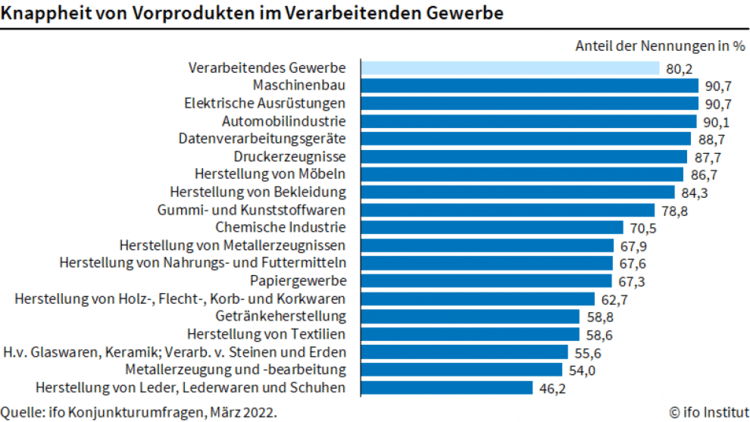 In den Schlüsselbranchen der deutschen Industrie sind die Anteile auf sehr hohem Niveau nahezu unverändert geblieben. So berichteten rund 90 Prozent der Unternehmen aus der Automobilindustrie, dem Maschinenbau, der Elektroindustrie von Lieferproblemen. In der Chemischen Industrie stieg der Anteil von 58,4 auf 70,5 Prozent. Auch bei den Herstellern von Bekleidung berichteten deutlich mehr Unternehmen von Knappheiten. „Ursprünglich hatten die Unternehmen für den Sommer mit einer Entspannung gerechnet. Die wird sich nun weiter verzögern“, ergänzt Wohlrabe.