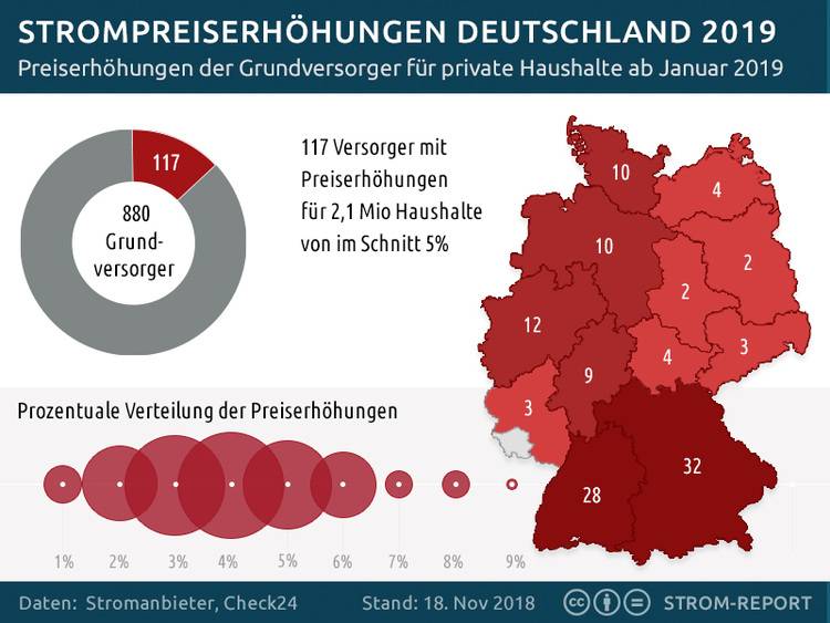 Bisher haben 117 Stromversorger Preiserhöhungen für das kommende Jahr um durchschnittlich 5,0% angekündigt. In den betroffenen Gebieten sind 2,1 Millionen Haushalte gemeldet. Die meisten Strompreiserhöhungen werden in Bayern [32] und Baden-Württemberg [28] durchgesetzt. Die bundesweite Spanne der Preiserhöhungen ist hoch - mit dem aktuellen Spitzenwert von 11,3% in Bayern [Stadtwerke Ebermannstadt]. Unter den Erhöhern ist in diesem Jahr auch die EnBW, die den Kilowattstunden-Preis um 3,8 % anhebt.