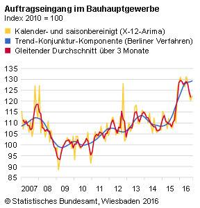 Der saison-, arbeitstäglich- und preisbereinigte Auftragseingang im Bauhauptgewerbe war im September 2016 um 1,6 % höher als im August 2016. Im weniger schwankungsanfälligen Dreimonatsvergleich nahm das Volumen der saison-, arbeitstäglich- und preisbereinigten Auftragseingänge von Juli bis September 2016 gegenüber April bis Juni 2016 um 5,5 % ab.