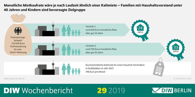 Die monatlichen Mietkaufzahlungen wären über die Laufzeit stabil und würden in etwa der Miete für eine vergleichbare Wohnung entsprechen. Im Fall einer beispielhaften 100-Quadratmeter-Wohnung, für deren Bau rund 210.000 Euro inklusive Nebenkosten investiert werden müssten, läge die Monatsrate bei einer Laufzeit von gut 24 Jahren bei rund 933 Euro – inklusive Erbpachtzins und einer Rücklage für Instandhaltungsmaßnahmen, die über die Jahre nötig werden. Bei einer längeren Laufzeit von etwa 33 Jahren wären es monatlich knapp 756 Euro. Zum Vergleich: Eine Familie mit Kindern hat in einer Großstadt im Jahr 2017 durchschnittlich rund 750 Euro Kaltmiete pro Monat gezahlt.