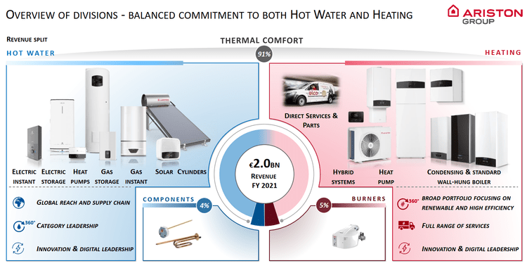 Ariston ist eine börsennotierte Unternehmensgruppe mit Geschäftssitz in Mailand, die sich auf die Bereiche Warmwasserbereitung und Wärmeerzeugung spezialisiert hat. Vorstandsvorsitzender des 1930 gegründeten Familienunternehmens ist Paolo Merloni. Die italienische Gruppe mit Rechtssitz in den Niederlanden setzt rund 2 Milliarden Euro um, beschäftigt etwa 8.000 Mitarbeiter und ist in über 150 Länder vertreten (Datenstand: Ende 2021).