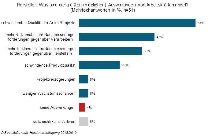 Die Auswirkungen von fehlenden Arbeitskräften sind natürlich vielfältig, doch die Tendenz ist überdeutlich: Drei Viertel der befragten Hersteller gehen davon aus, dass der Personalmangel am Bau zu einer schlechteren Ausführungsqualität der Projekte führt. Das Echo, das zu den Herstellern dringt, sind vor allem mehr Reklamationen: Rund jeder zweite Hersteller (47 Prozent) berichtet, dass sie durch Personalmangel der Verarbeiter häufiger mit Reklamationsfällen zu tun bekommen, da die Endkunden vermehrt Nachbesserungswünsche bei den Verarbeitern geltend machen.