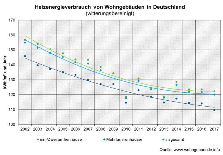 Zwischen 2002 und 2012 hat die Energieeffizienz demnach kontinuierlich und deutlich zugenommen. Seitdem gibt es jedoch kaum noch Fortschritte – auch bei Mehrfamilienhäusern, aber vor allem bei Ein-/Zweifamilienhäusern.