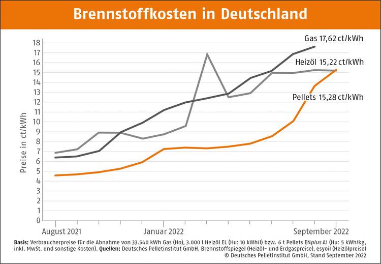 Und was kosten Pellets in der Schweiz? Laut einer Erhebung von pelletpreis.ch sind die Pelletpreise pro Tonne im September gegenüber August um 11% auf CHF 616.50 gestiegen (rund 643 Euro). Verglichen mit September 2021, als eine Tonne durchschnittlich CHF 340,60 kostete, betrug der Preisanstieg 81%.