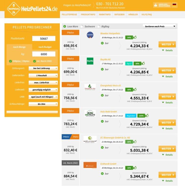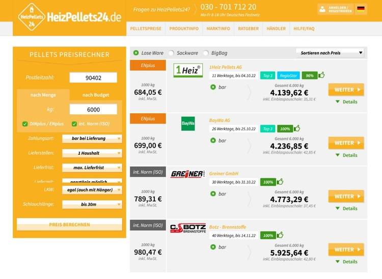 Wer Pellets bestellen möchte, sollte unbedingt mehrere Angebote einholen. Denn zum einen gibt es in Deutschland regionale Unterschiede: Laut DEPI lag Mitte September 2022 der durchschnittliche Pelletpreis (Abnahme 6 t)