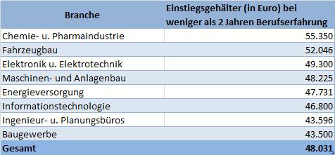 Insgesamt sind die Gehälter in den einzelnen Branchen durchweg gestiegen. Spitzenlöhne bekommen Ingenieure der Chemie- und Pharmaindustrie. Mit mehr als 55.300 Euro führt die Branche das Ranking der Einstiegsgehälter mit Abstand an.