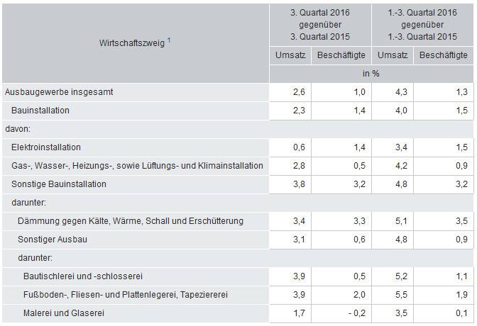 Wie schon in den ersten beiden Quartalen des Jahres 2016 gab es auch im dritten Quartal in allen Wirtschaftszweigen des Ausbaugewerbes ein Umsatzwachstum. In der Bauinstallation stiegen die Umsätze im dritten Quartal 2016 um 2,3% gegenüber dem entsprechenden Vorjahreszeitraum. Innerhalb dieses Wirtschaftszweiges gab es in der sonstigen Bauinstallation (zum Beispiel Dämmung gegen Kälte, Wärme, Schall und Erschütterung) mit + 3,8% das stärkste Umsatzwachstum.