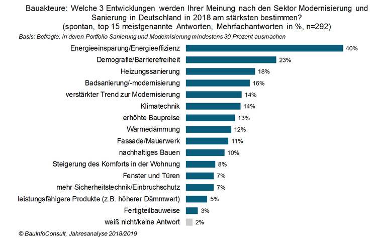 Das Düsseldorfer BauInfoConsult-Institut hat Branchenakteure aus dem Sanierungs- und Modernisierungssegment – darunter Architekten und Bauhandwerker – nach den wichtigsten derzeitigen Entwicklungen in diesem zentralen Baubereich erfragt. Dabei zeigen die Ergebnisse, dass die 292 telefonisch befragten Bauakteure zwei ausschlaggebende Trends im Sanierungs- und Modernisierungsbereich sehen: So dürfte in 2018 ihrer Meinung nach die Trendthemen Energieeffizienz (40%) und Demografie bzw. Barrierefreiheit (23%) den Sanierungsmarkt gegenwärtig am stärksten mitbestimmen.