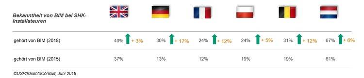 Allerdings: Der Anteil der deutschen SHK-Installateure, die BIM tatsächlich schon anwenden, ist recht gering – ähnlich wie im Nachbarland Belgien, wo die SHK-Profis aber ebenfalls immer mehr auf BIM aufmerksam werden (+12 Prozent mehr Bekanntheit als 2015). Im baulich eher konservativen Frankreich dürfte sich die dort ebenfalls noch niedrige Verwendung von BIM vielleicht schon bald ändern: Auch hier hat sich die Bekanntheit von BIM in der Branche binnen drei Jahren verdoppelt (um 12 Prozent auf ein Viertel der französischen Heizungs- und Sanitärhandwerker). Dabei dürfte die bevorstehende gesetzliche Einführung einer BIM-Verpflichtung in allen öffentlichen Projekten der Grande Nation eine nicht unwesentliche Rolle gespielt haben.