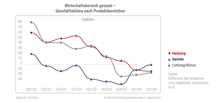Während sich die Nachfrage im Bereich Heizung im vergangenen Jahr noch deutlich positiver entwickelt als die anderen beiden Produktbereiche hat, lag das Geschäftsklima im Bereich Heizung im 1. Quartal 2024 erstmalig im negativen Bereich. Diese negative Entwicklung setzt sich im aktuellen 2. Quartal 2024 mit einem Geschäftsklima von − 13 fort.