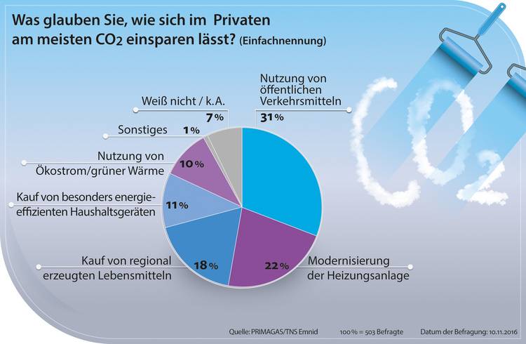 Was glauben Sie, wie sich im Privaten am meisten CO2 einsparen lässt? Das war die Frage, die Kantar Emnid im November im Auftrag des Flüssiggasversorgers Primagas rund 500 Deutschen stellte. 31% der Umfrageteilnehmer gehen davon aus, dass sie das meiste CO2 einsparen können, indem sie öffentliche Verkehrsmittel statt des eigenen Autos nutzen. 22% wiederum sind davon überzeugt, dass die Modernisierung der Heizungsanlage das größte CO2-Einsparpotenzial birgt. 18% sind der Meinung, dass sie durch den Kauf von regional erzeugten Lebensmitteln den größten Beitrag leisten. Auf energieeffiziente Haushaltsgeräte setzen 11 %, während 10% das größte Einsparpotenzial bei erneuerbaren Energien und grüner Wärme sehen.