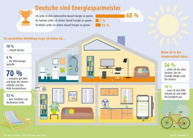 Dreiviertel der deutschen Bevölkerung denkt auch in der Sommerzeit an das Thema Energiesparen und wie sie weniger Strom verbrauchen. Zu dem Ergebnis kommt eine repräsentative Umfrage des Marktforschungsinstitut YouGov im Auftrag des Energie- und IT-Unternehmens LichtBlick.