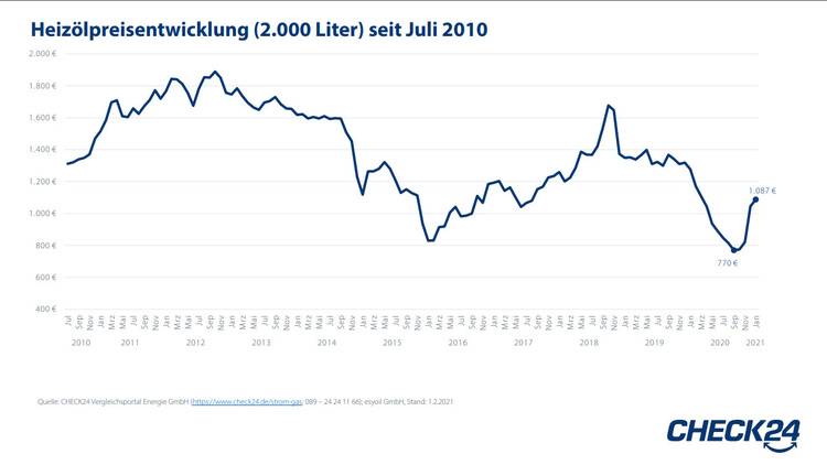 - „Heizöl ist aktuell noch vergleichsweise günstig. Seit dem Preistief im September ist der Heizölpreis allerdings um 41 Prozent gestiegen“, sagt Lasse Schmid. „Nicht zuletzt durch die neue CO2-Abgabe müssen sich Verbraucher*innen 2021 auf deutlich steigende Kosten bei Heizöl gefasst machen.“