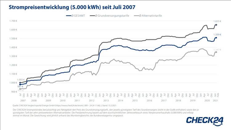 - „Nach einer kurzen Entspannung im vergangenen Jahr steigt der Strompreis 2021 wieder und klettert weiter von Rekord zu Rekord“, sagt Lasse Schmid. „Der Wechsel aus der Grundversorgung zu einem alternativen Anbieter lohnt sich und spart Verbrauchern eines Musterhaushalts im Schnitt 308 Euro im Jahr.“