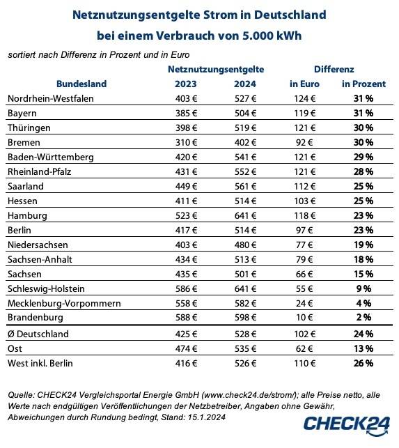 Eine Familie mit einem Verbrauch von 5.000 kWh zahlt im Januar 2024 im Schnitt 1.846 Euro für Strom. Das sind elf Euro weniger als im Dezember 2023. Ende 2023 wurden für dieselbe Menge Strom durchschnittlich 1.857 Euro fällig. Ein wesentlicher Bestandteil des Strompreises sind die Netzentgelte. Aufgrund der Entscheidung der Bundesregierung, die Subventionen für die Netzentgelte zu streichen, steigen die Netzkosten 2024 deutlich und damit auch die Strompreise.
