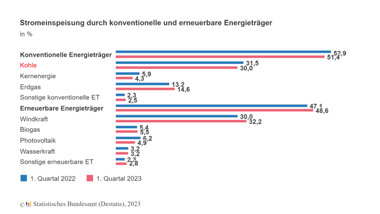 Den größten absoluten Rückgang bei der Stromeinspeisung aus konventionellen Energieträgern verzeichnete die Einspeisung aus Kohle mit einem Minus von 5,5 Milliarden Kilowattstunden (-12,1 %). Den zweitgrößten Rückgang gab es bei der Einspeisung aus Kernenergie, die um 2,8 Milliarden Kilowattstunden abnahm (-32,7 %) – bereits vor der Abschaltung der letzten drei Kernkraftwerke Isar 2, Emsland und Neckarwestheim 2 zum 15. April 2023. Die Stromeinspeisung aus Erdgas stieg dagegen im Vergleich zum 1. Quartal 2022 wieder leicht um 2,4 % und erreichte einen Anteil von 14,6 % (1. Quartal 2022: 13,2 %) an der gesamten Stromerzeugung, lag aber unter dem Niveau vom 1. Quartal 2021 (16,2 %).